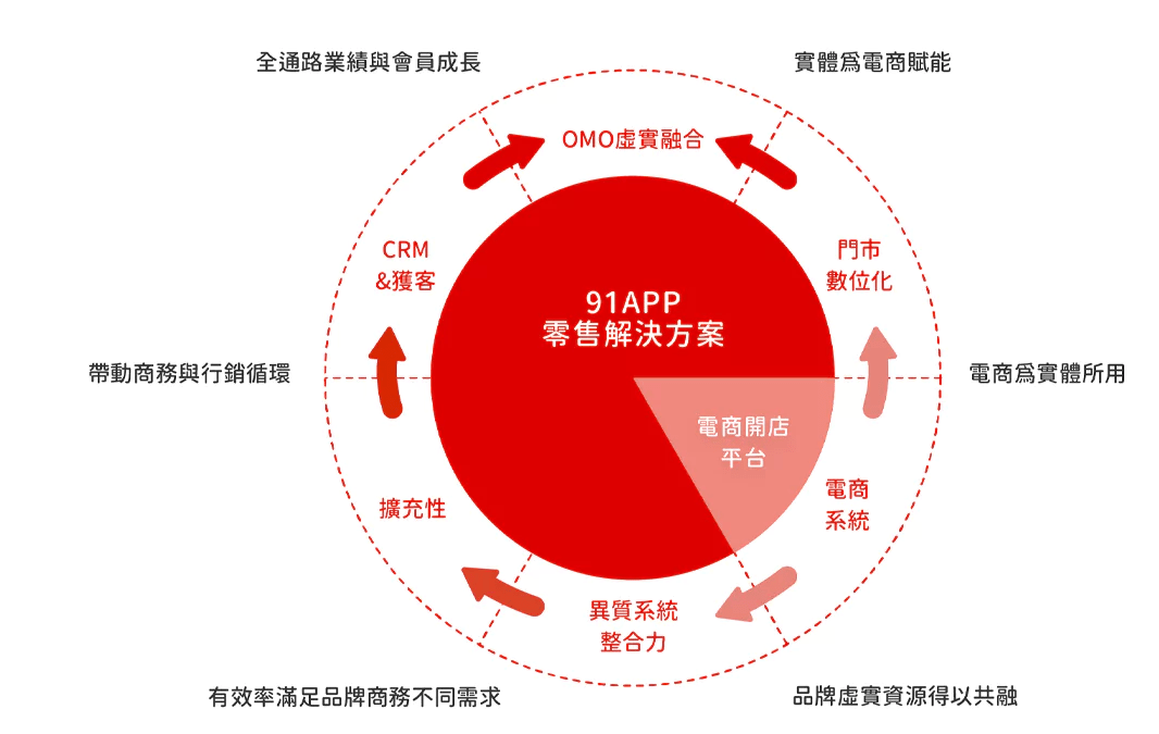 91APP 零售解決方案從門市數位化和系統整合兩條路徑分別出發,每個步驟環環相扣、相互承接,最終融合全通路組織、資源、庫存和行銷,引領品牌從零售觀點出發,達成全通路成長。
